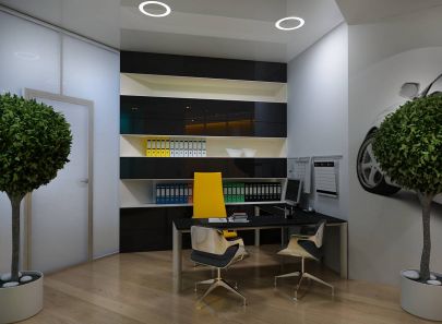 Желтые диван и кресло – самые яркие предметы в обстановке. Контрастирует им черный глянец столешницы и стеллажа с документами. Настенное фотопанно подобрано в автомобильную тематику. Вечнозеленые деревья с круглой кроной в приемной, коридоре и кабинете вносят в деловой интерьер уют.