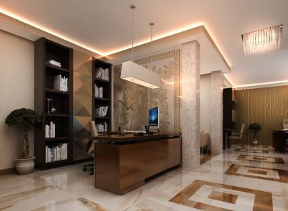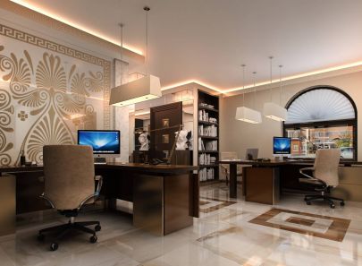 Задачей проекта было создать современный, гармоничный дизайн офиса в античной стилистике. В основу легли принципы симметрии и повторения, геометрические орнаменты, благородные материалы и декор.