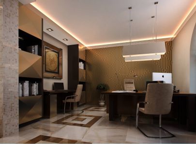 Рабочие места размещаются у окон, а также вдоль стен. Каждое освещается подвесным линейным светильником. Окрашенные в бежевый тон гладкие стены гармонируют с такой же напольной плиткой под мрамор. Крупные фигуры квадратов выложены на полу холла темной коричневой плитой. В поддержку цветовому акценту одна из стен выделена пестрыми коричневыми обоями с ромбическим рисунком.