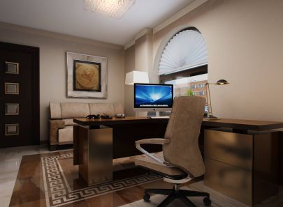 Интерьер кабинета повторяет основные дизайнерские решения. Здесь и орнаментальный плиточный «ковер» в центре комнаты, и обои с ромбами в качестве насыщенного цветового пятна, и античные полотна в широких рамах. Создана респектабельная, без излишнего пафоса обстановка для ежедневной работы, общения с партнерами.