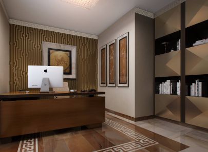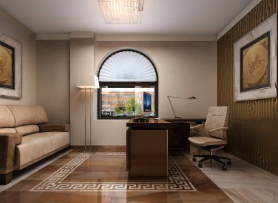Декоративный акцент сосредоточен на оформлении пола и стен. Пол в нише выложен темно-песочной плиткой под мрамор с крупным орнаментальным кантом по периметру. Для узора выбран узнаваемый и популярный во все времена греческий меандр – непрерывная лента, состоящая из прямых углов. Такой же орнамент украсил потолочные карнизы по всему офису, красивой цепочкой связав помещения в едином стиле.