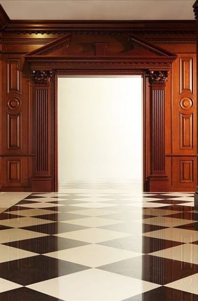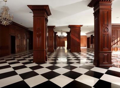 Классический стиль интерьера, выбранный для дизайна холла в столичном офисном центре и воплощенный в богатстве древесных фактур, с шахматным полом и массивной колоннадой, – это демонстрация стабильности, уважения к традициям, высокого статуса владельцев.