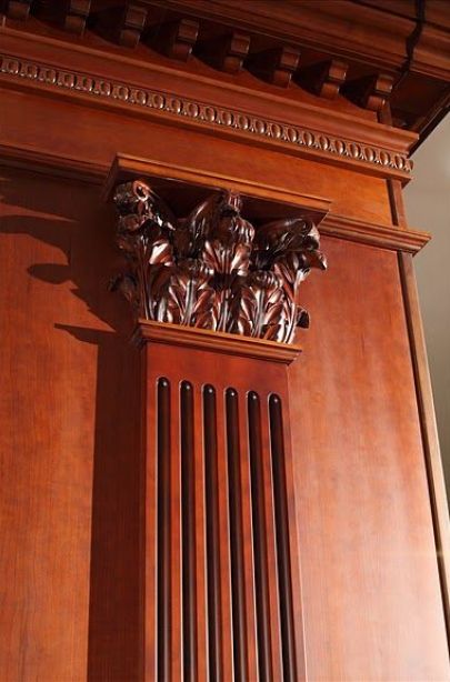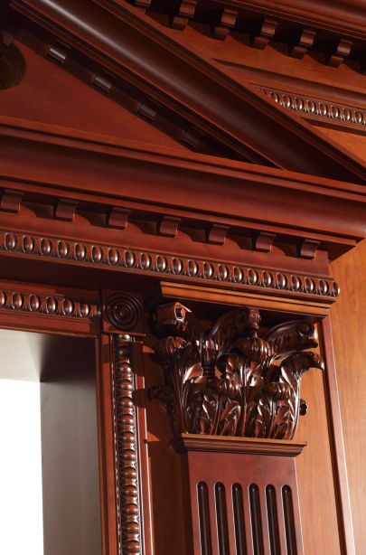 Парадное звучание интерьеру придает отделка деревом. Все стены, включая входную группу, обшиты деревянными панелями с классической филенчатой раскладкой. Насыщенная красно-коричневая древесина красиво переливается в солнечных лучах из высоких оконных проемов, обилие дерева отсылает к традиционным кабинетным интерьерам в викторианском стиле, дорогим и аристократичным.