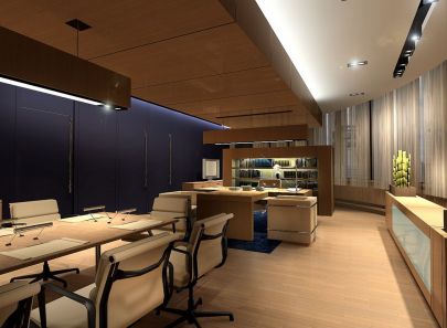 Место руководителя организовано, как и в первом случае, с Т-образным столом и креслами по сторонам брифа. Пол акцентирован темно-синим ковром, в этот же цвет окрашена продольная стена. Насыщенный синий – благородное дополнение к природной гамме интерьера.