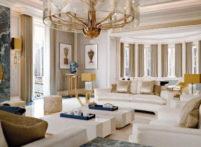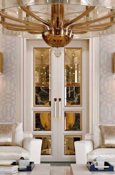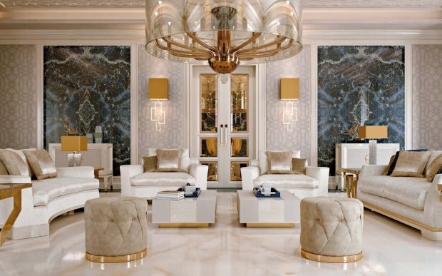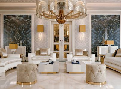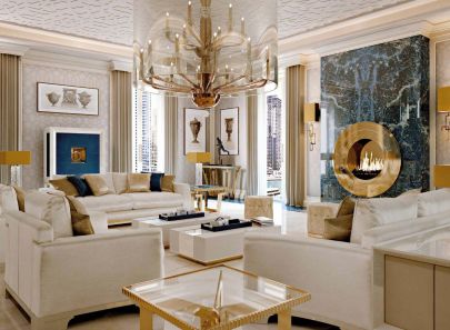 Активно используется золотой цвет: в дизайне светильников, столиков, подставок, диванных подушек, кресел. Мощный зрительный акцент сделан на круглый портал встроенного камина в широкой золотой оправе. На фоне перламутрово-белой мягкой мебели и светлого пола золотые краски создают в дизайне элитной городской квартиры сбалансированный ансамбль.