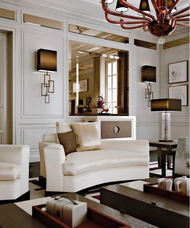 - Заданную потолком прямолинейность продолжает отделка стен. Вместо обоев их оформили группами из молдингов в виде симметричных рельефных панелей. В каждой из таких панелей размещается светильник или картина, за счет чего дизайн элитного интерьера наполнился эксклюзивными авторскими работами.
