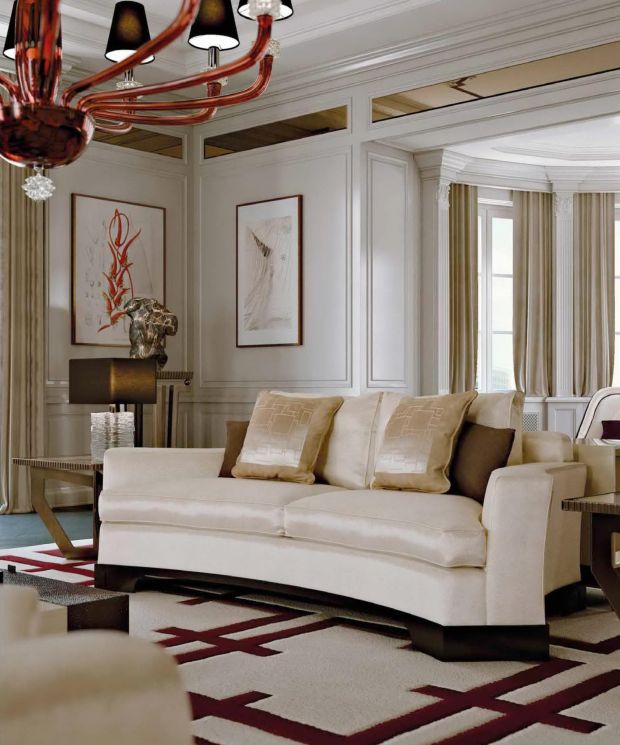 Гостиная занимает просторное помещение с боковым широким эркером. В оформлении важно было подчеркнуть объем парадной зоны, наполнить его красивыми цветовыми и фактурными акцентами.