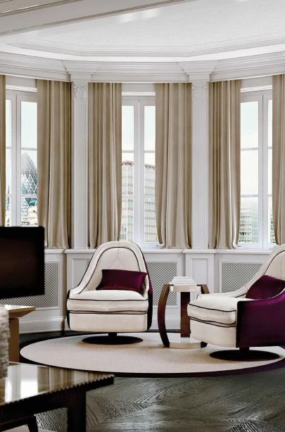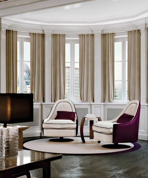 Полукруглую конфигурацию эркера повторили форма ковра и дисковые опоры кресел. На эти детали интерьера пришлось и цветовое выделение зоны – темно-лиловым.