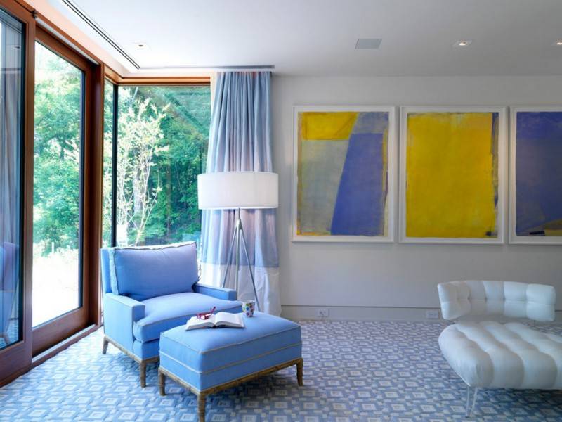 Голубой популярен в оформлении гостиных, спален, детских, он олицетворяет небо и море. По словам психологов, окрашенные в голубой стены комнаты успокаивают нервную систему, избавляют от тревожности, помогают расслабиться.